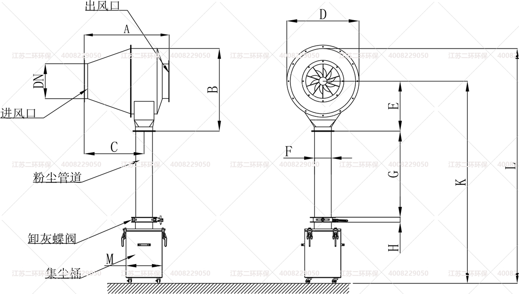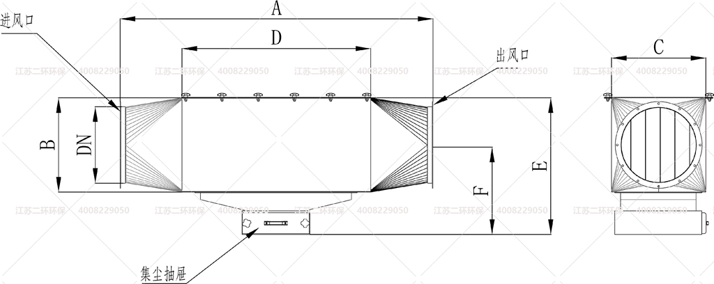 4、旋流型管道火花捕捉器,內部安裝了旋流板,使進入的火花急速產生氣流渦旋,多次撞擊而熄滅,掉入底部灰倉。