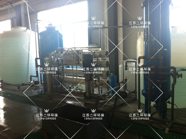 自來水→原水箱→原水泵→機械過濾器(絮凝劑加藥)→活性炭過濾器(阻垢劑加藥)→保安微濾器→高壓泵→反滲透裝置→ 淡水箱→淡水泵→混合柱(1用1備)→酸堿再生裝置→純水箱→純水泵→用水點